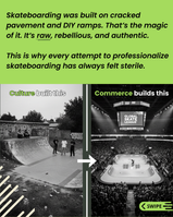 Skateboarding was built in empty pools and back alleys on cracked pavement with DIY ramps. That’s the magic of it - raw, rebellious, and authentic. Which is why every attempt to professionalize it has always felt like bottling lightning. The result? Boring and sterile (Olympics, anyone?).